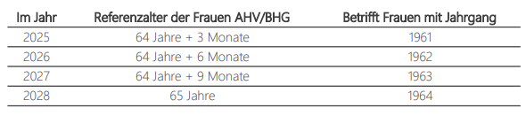 The reference age (new term for retirement age) of women is gradually being increased by three months per year. The increase starts in 2025.