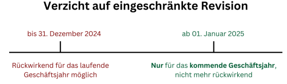 Companies with less than ten full-time employees have so far been able to dispense with a limited audit with the consent of all shareholders. From January 1, 2025 **this waiver only applies for the next fiscal year**, no longer retroactively.