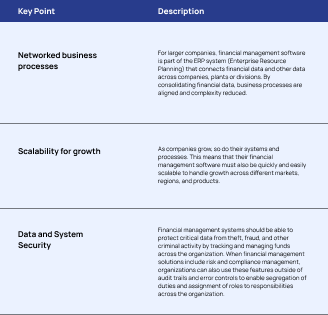 Financial management software includes tools and processes that manage and control income, expenses, and assets. An overall goal for any financial management solution is not only to maintain a company's day-to-day business operations, but also to maximize profits and continuously protect financial data from fraud and theft. In principle, an accounting system should offer the following benefits: